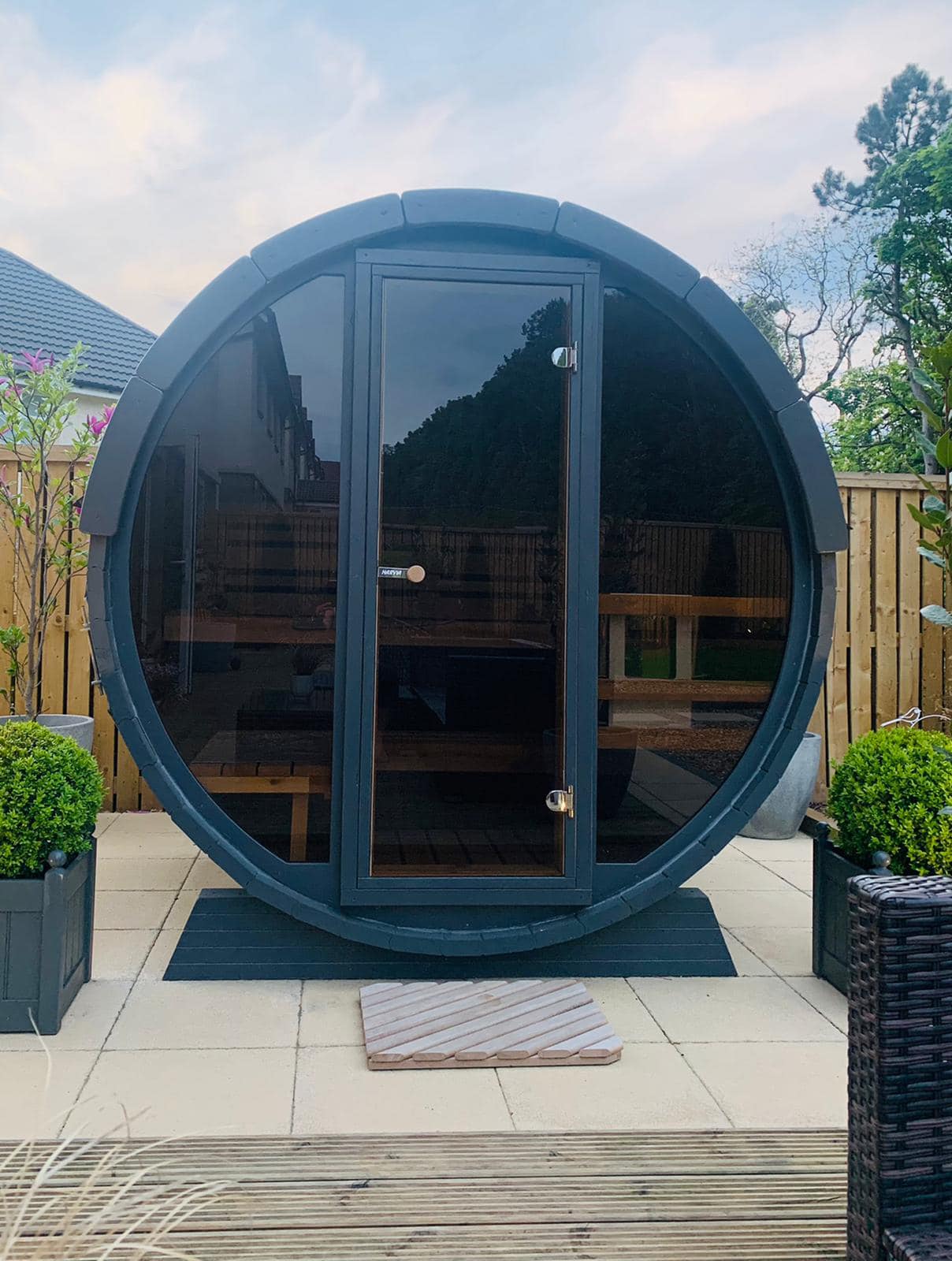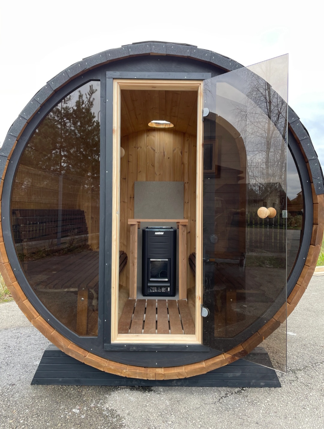 Material: 28 mm/42 mm; sauna bench material: alder; floor grates material: spruce; door: L 590 mm x H 1690 mm; roof: black, brown, red, green ; 8 mm bronze glass; window: front glass wall(safety class)